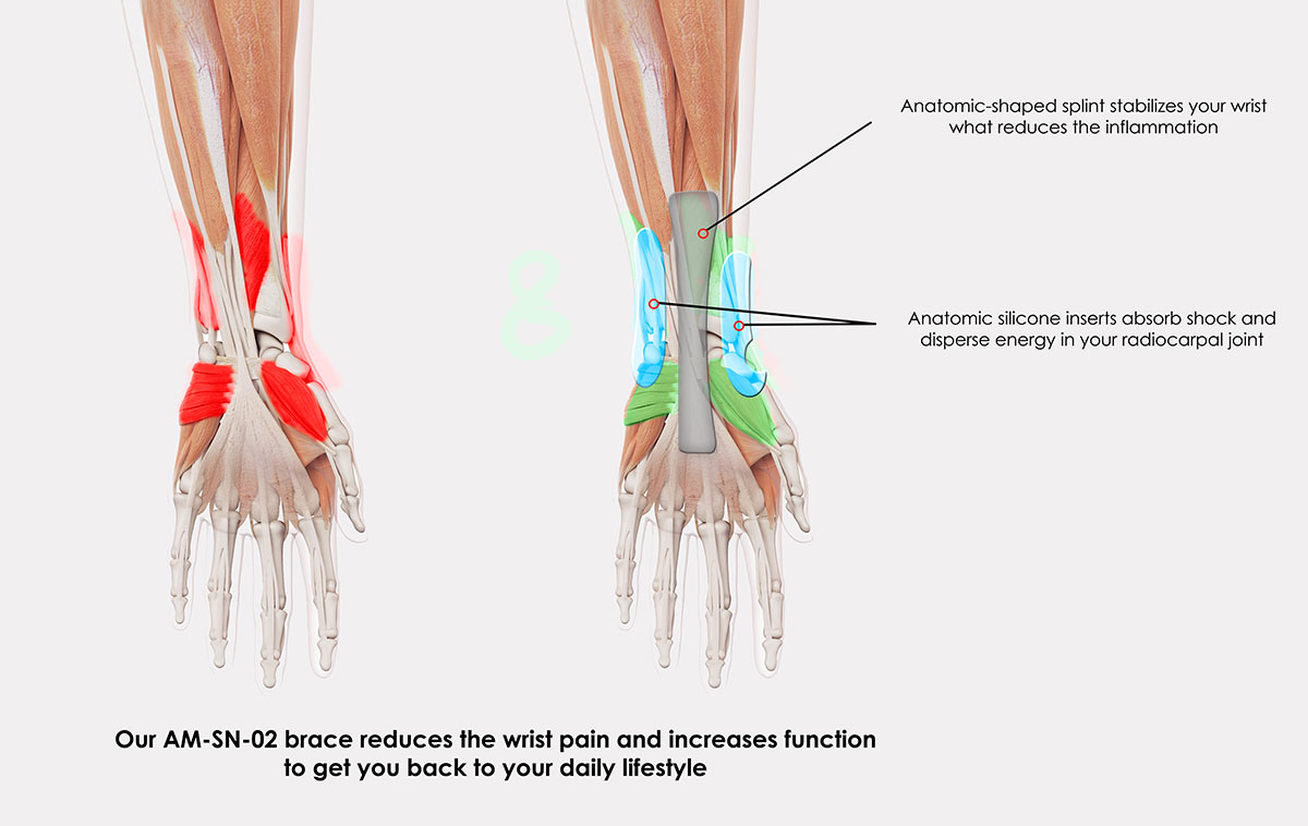 If you suffer from synovial tendon sheath, arthrosis of the radiocarpal joint or after injury period, the AM-SN-02 brace is created for you. It supports the joint and relieve the pain. Inside is equipped with silicone pads, which compress the nerves and blood vessels and reduce the pain.