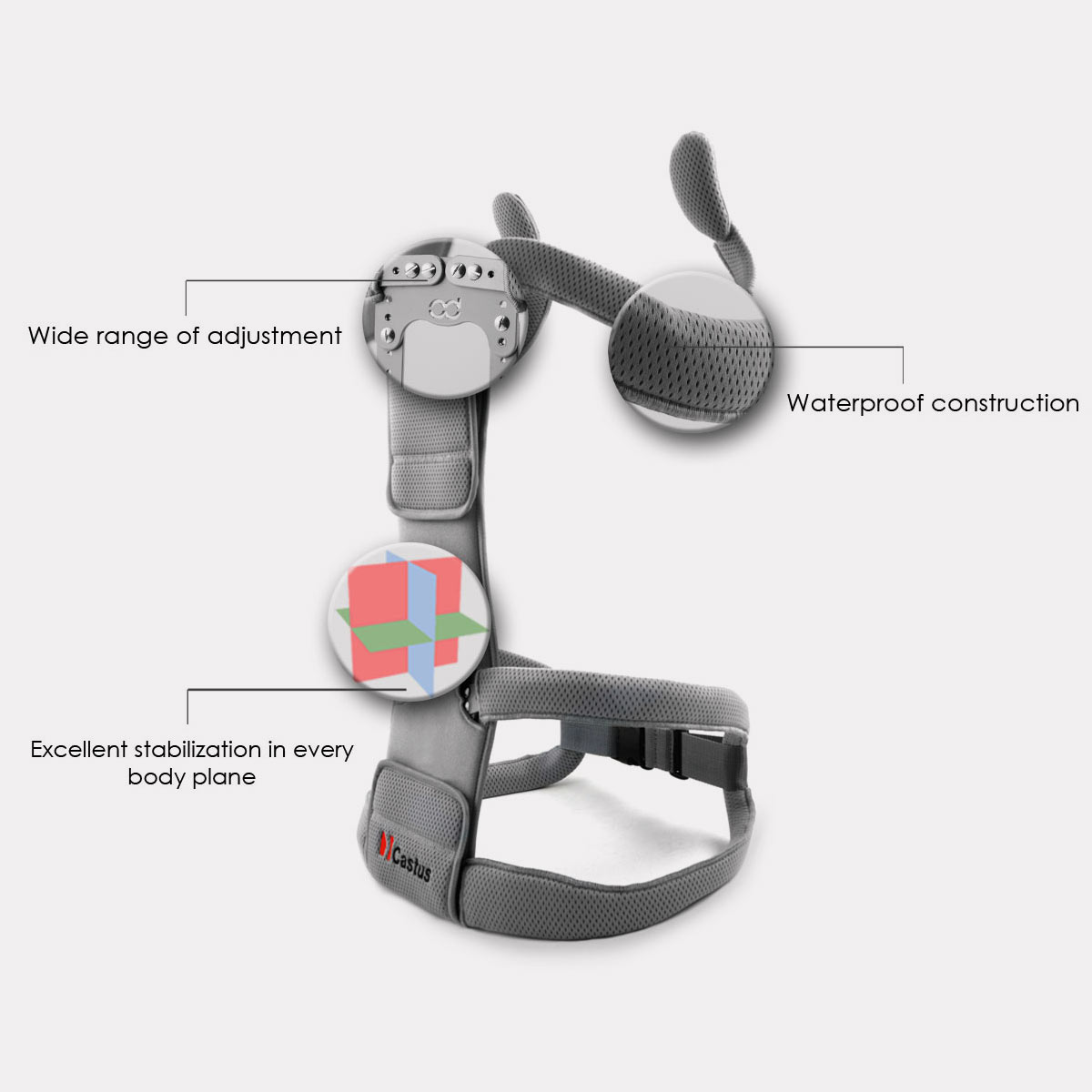 CASTUS is equipped with adjusted dynamics, provided by armpits stabilizers. With this solution, you can turn the dynamics off or make the brace more rigid. The armpits stabilizers can be used for both or only one side. Because of that, when you suffer from left curved scoliosis, you can make the brace rigid only on the left side.