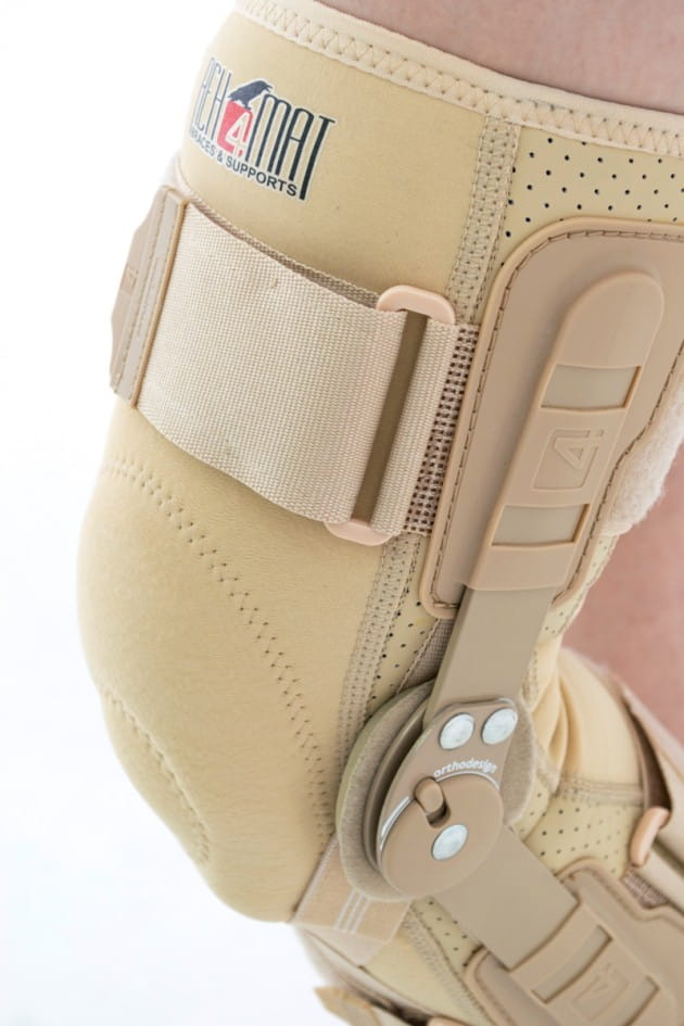 The orthopaedic splints 1R is the innovative solution with flexion and extension adjustment. The drop lock is very small (diameter: 30 mm) and provides 15° ROM adjustment. In addition, we apply the allen screws, which are mounted by steel pins and magnet. The most innovative is the blocking disk with the ratchet, which ensures required angle of ROM. In the short knee braces the splints 1R are universal, so they fit for both legs, but in the long knee braces the splints 1R have anatomic shape for right or left leg.
