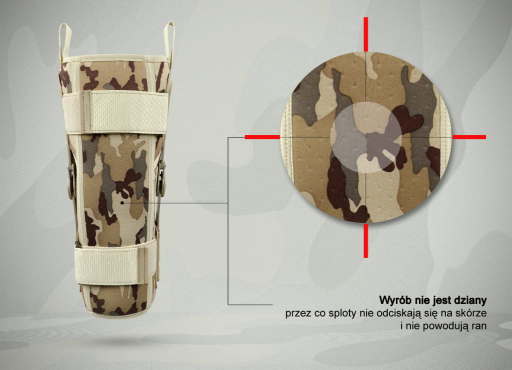 ActivPren™ is made of perforated neoprene foam with polyamide cover. This external layer is covered by moro camouflage. Perforation and AirSupplySystem support the knee joint and allows skin to breath.