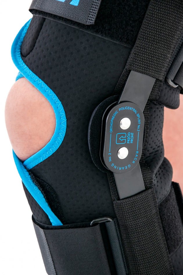 Splints [2] – double-axis polycentric splints equipped with rack and pinion, which reflects the anatomic movement of the knee joint. It is made of high quality aluminium alloy, with durable sanded cover, which protects the splint from influence of sweat and salt. Splint is equipped with specially shaped silicone insert to stabilize the splint and additionally release stress from the knee joint.