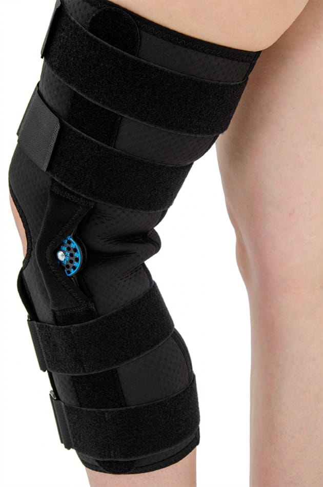 It has four independent sets of Velcro straps. The device is equipped with 1-axial sides splints, made of high quality polyamide with carbon fibres. Replacing of traditional metal splint with our innovative solution allows to decrease the weight of the brace a few times. The splints setting and their elastic construction causes great lower limb stabilization. Furthermore, the length of the splints is bigger and special four sets of Velcro straps provide excellent frontal and sagittal stabilization. The splints are equipped with ROM adjustment in every 15o. This precise adjustment facilitates the rehabilitation process of the injured knee joint. The brace is wrap around designed what is the great solution for seniors with limited mobility.